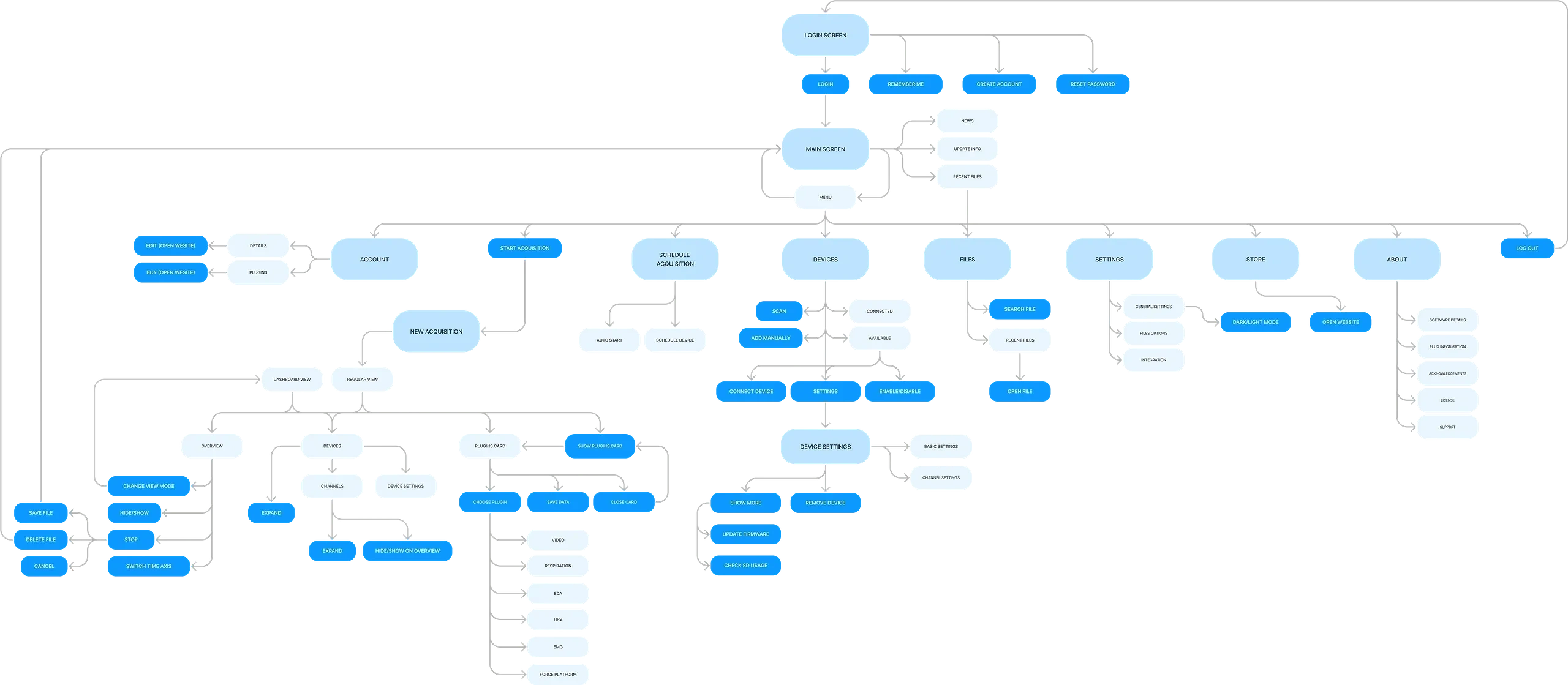 With the requirements and main pages defined, I worked with the team to create the project’s structure, mapping features and page connections. We began working on the desktop version due to existing APIs, followed by the mobile versions. The desktop version includes device connections, settings, live and scheduled acquisition, real-time analysis, plugins, and a file manager.